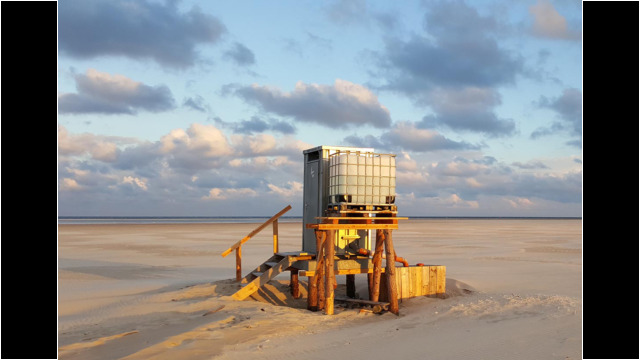 Die Abendsonne vergoldet das WC-Häuschen am Strand von Wittdün
