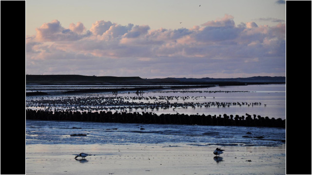 Abendstimmung auf Amrum, das sind nicht nur spektakuläre Sonnenuntergänge auf der Seeseite im Bereich Norddorf. Bei Nebel, Süddorf und Wittdün färbt sich der Strand golden und der Himmel in Stufen von Blau über Gelb, Orange und Rot hin zum dunklen Violett. An der Ostküste, am Wattenmeer, schafft die sinkende Sonne Minute für Minute ein anderes Landschaftsbild im ständigen Wechsel der Farben. Oft kommt hier auch der Wind zum Abend hin zur Ruhe, wird ablandig. Die Rufe der Vögel untermalen die Stimmung; bei Flut kommen sie vom nahen Meeressaum, bei Ebbe von weit draußen im Wattenmeer.