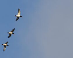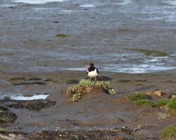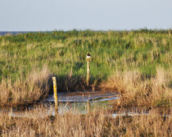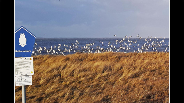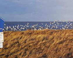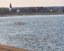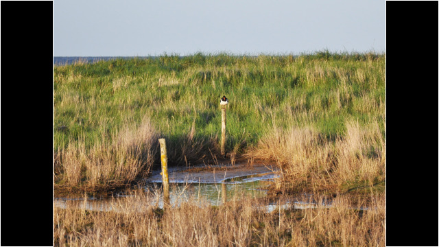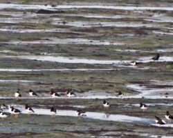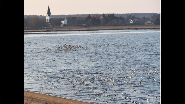 Austernfischer sind auf Amrums Wattseite allgegenwärtig. Mit ihren lauten, hellen, fast pfeifenden Rufen prägen sie bei Tag und auch nachts das Klangbild der Insel entscheidend mit. Allein, zu zweit, zu dritt oder in der kleinen Gruppe rasen sie schnell und laut wie Abfangjäger über den Himmel. Bei Flut gibt es auch mal größere Gruppen am Ufer. Gerne beobachten sie von erhöhten Standorten aus ihre Umgebung: vom Dach, vom Pfahl oder einem kleinen Hügel. Und wenn sie gemeinschaftlich im Watt oder auf der Wiese picken, hat der Anblick der schwarz-weißen Vögel, deren Schnabel, Augen und Beine orange leuchten, durchaus eine komische Note. Mehr über Austernfischer gibt’s bei Wikipedia.