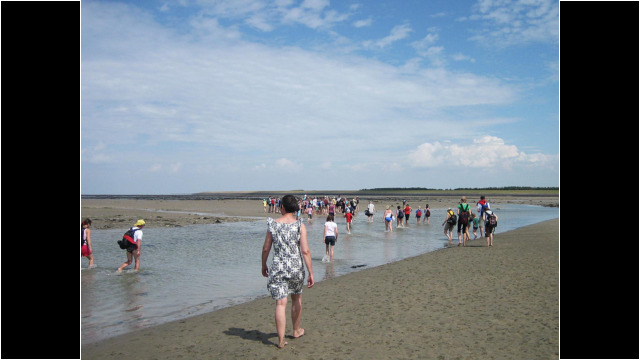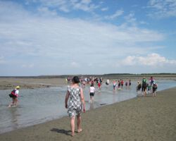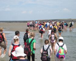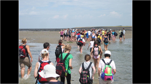Wattwanderer durchqueren den Priel in Richtung Föhr