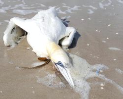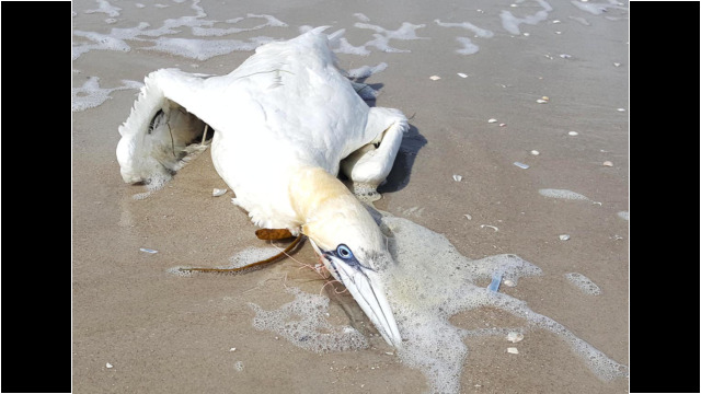 Toter Basstölpel mit Netzmaterial im Schnabel
