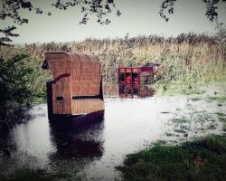 Vor einer Sturmflut müssen alle Strandkörbe in Sicherheit gebracht werden